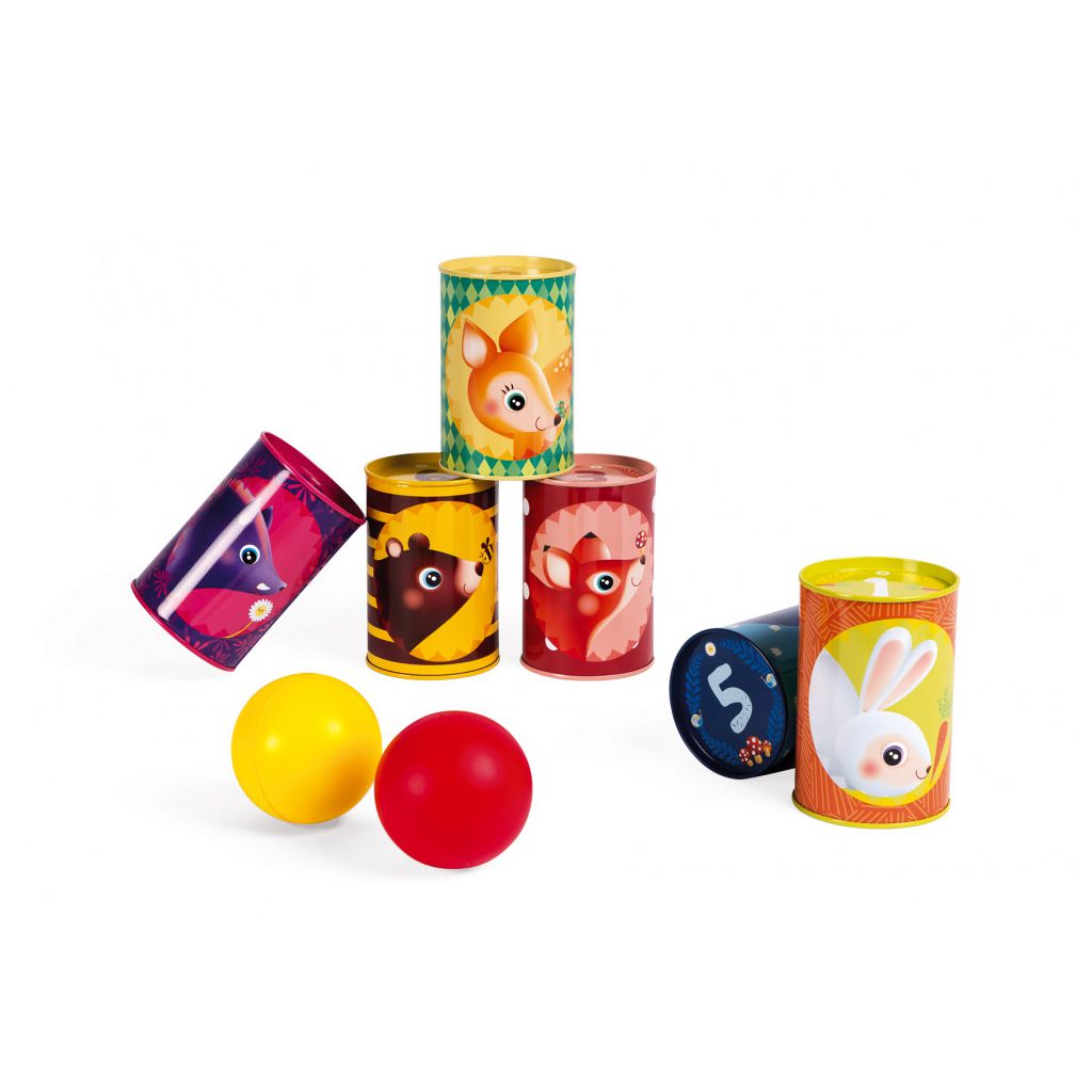 Ce chamboule-tout est composé de 2 balles en mousse, une jaune et une rouge, et de 6 boites en métal de couleurs vive représentant un animal de la forêt et qui est numéroté sur le dessus et le dessous :