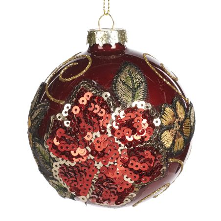 Boule en verre de couleur bordeaux avec une broderie collée constituée d’une fleur brodée en paillettes sequins rouge avec un contour en paillettes sequins or au centre. Entourée de deux fleurs à gauche et d’une fleur à droite brodées en fil jaune avec un contour noir pour les pétales et de fil blanc pour le centre. Les feuillages de toutes les fleurs sont brodés de fils vert foncé avec des nervures en fils noir. Le reste de la boule est joliment décorée par un fin liserai doré.