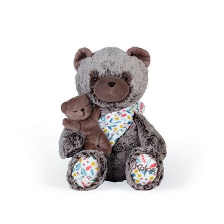 Doudou de la gamme" Linoo", personnages qui ont été spécialement choisis pour leurs liens protecteur avec leurs bébés, une belle invitation aux câlins. Peluche moelleuse et très douce qui cajole son ourson et le porte dans un joli porte bébé de coton joliment imprimé, votre enfant pourra laisser libre cours à son imagination en jouant à papa et maman.