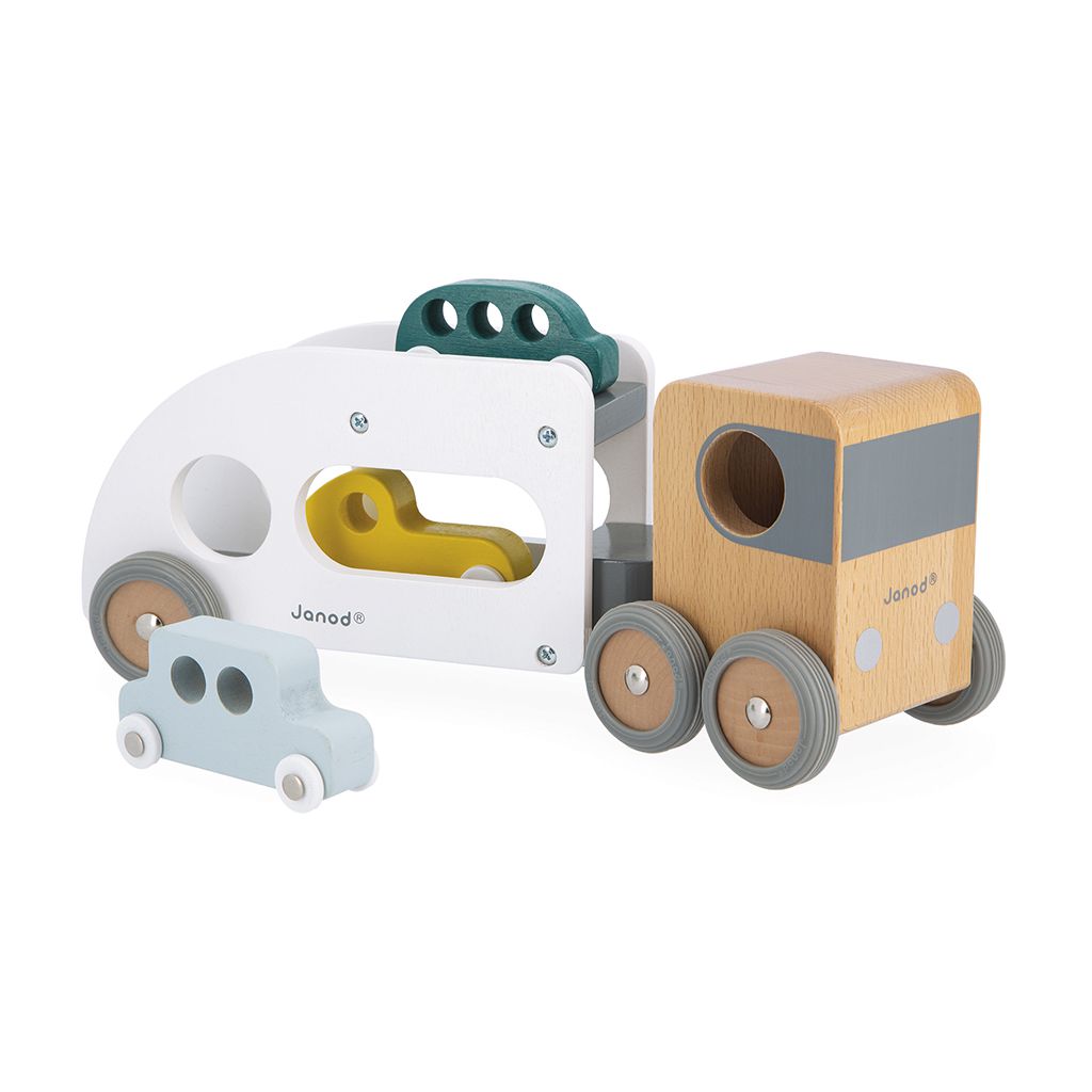 Idéal pour les enfants ce camion transporteur en bois comporte une remorque amovible et trois voitures Vroum vroum ! et en route pour de nouvelles aventures.