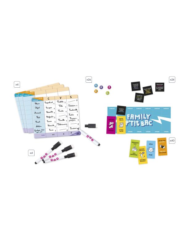 Cette boite de jeu se compose de 24 cartes contraintes, 4 plateaux ardoises individuels, 40 cartes catégories, 4 feutres effaçables, 1 plateau central, 26 jetons lettres et une notice.