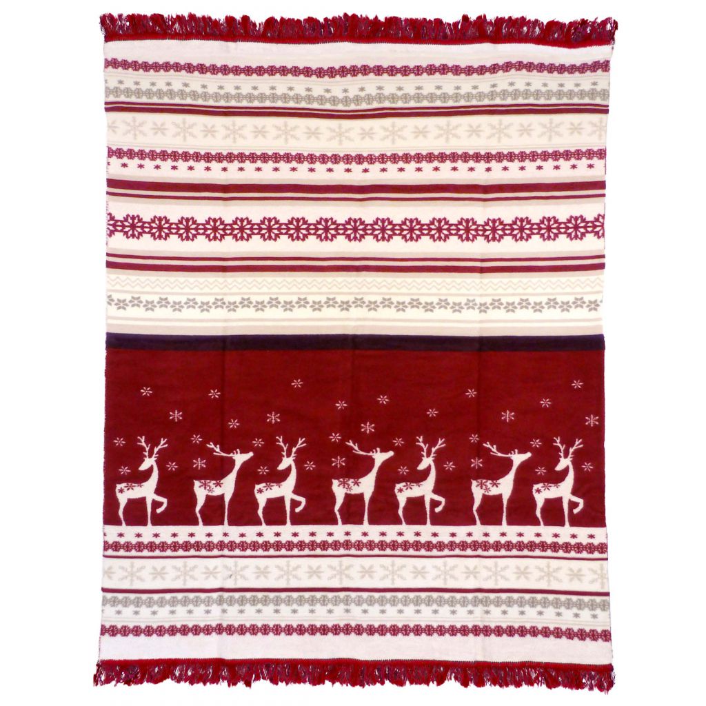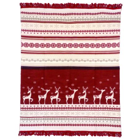Un plaid chaud qui ne passera pas inaperçu, sur une bande rouge une farandole de renne blanches décorent le bas de la couverture au milieu de lignes d'étoiles et de flocons rouge et beige. Elle sera parfaite pour décorer votre salon pendant les fêtes, déposez-le sur votre canapé, ses couleurs donneront à votre intérieur une ambiance festive et chaleureuse. Aspect couverture de laine.