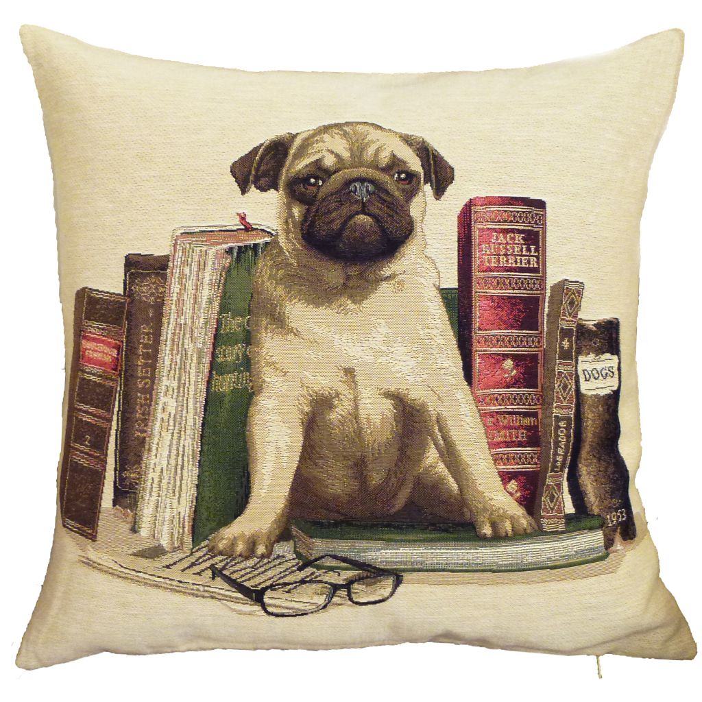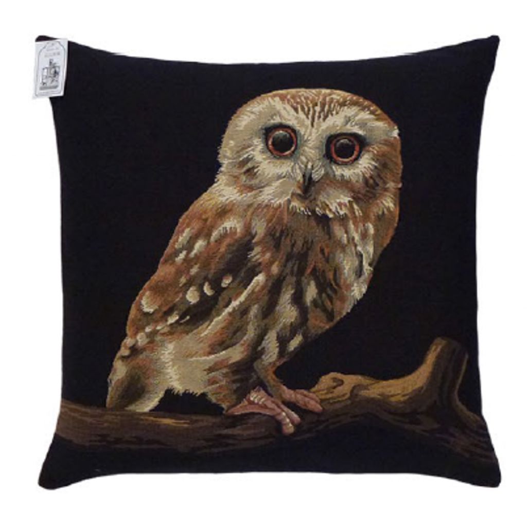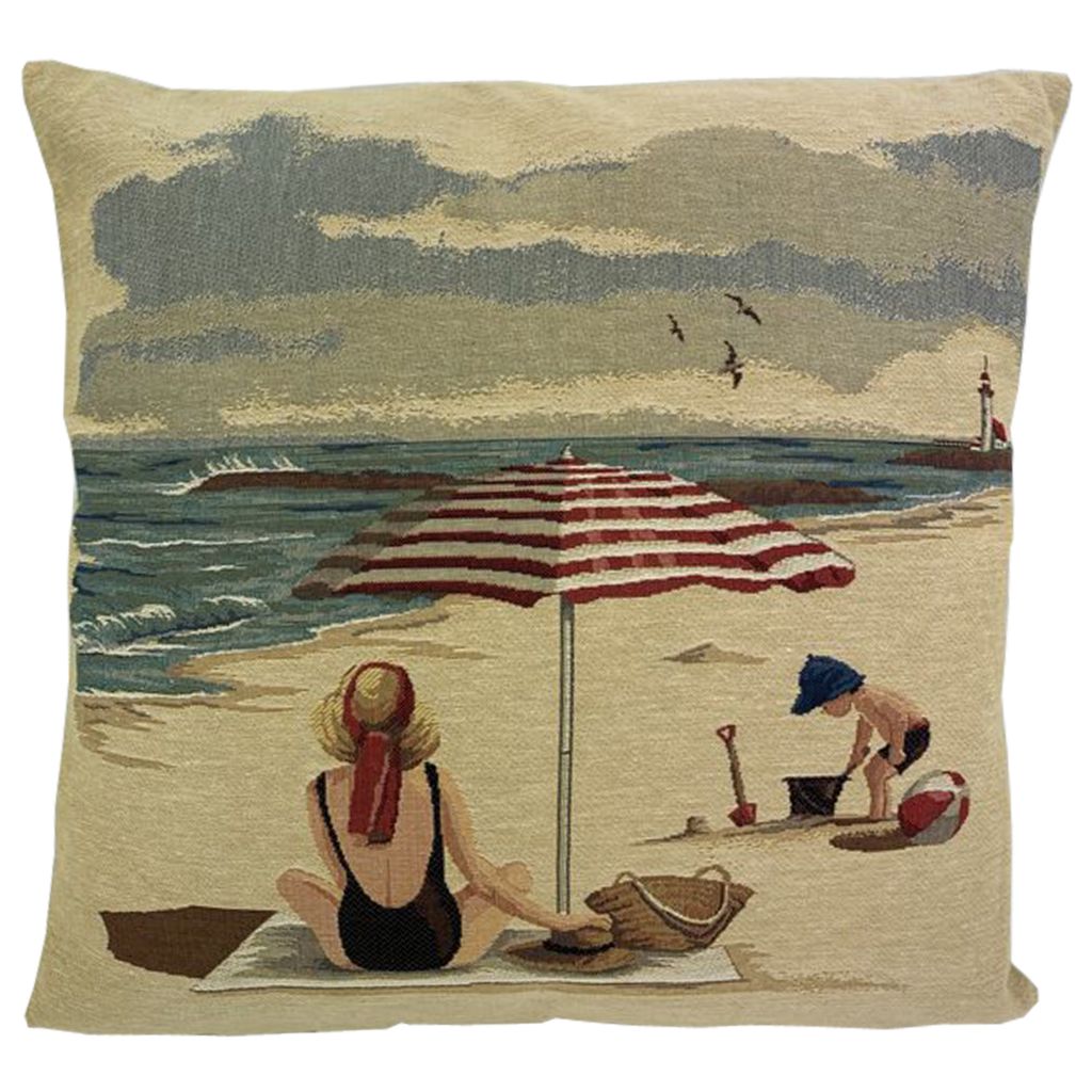 Housse de coussin en tapisserie, très belle finition, déhoussable grâce à une fermeture éclair sur le bas de la housse, le dos est en imitation velours, souple et de couleur beige clair.