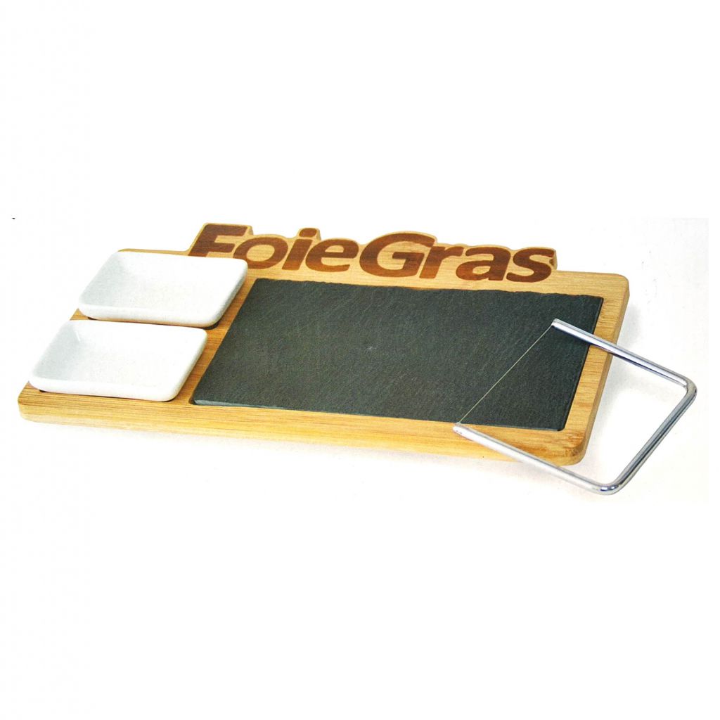 Plateau en bois rectangulaire, le bord du haut est détouré à la forme du mot Foie Gras qui est visible en bois plus foncé. La planche en ardoise et les deux petites coupelles blanches reste en place grâce aux empreintes faite sur le plateau en bois et peut être enlevé pour un meilleur nettoyage. La lyre est fournie.